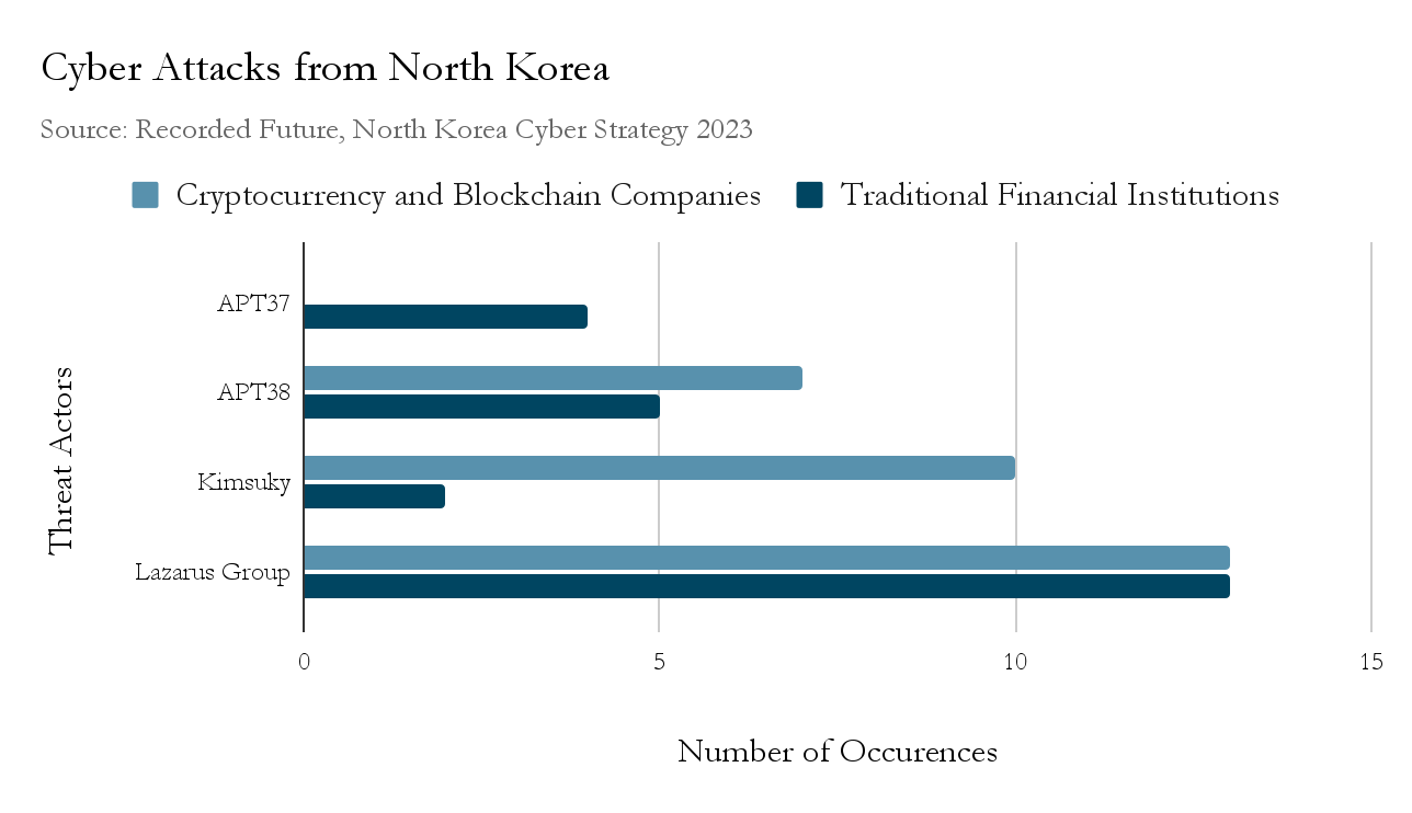 A 2023 Recorded Future report highlighted various actors involved in North Korean cyberattacks and the primary targets of such attacks. Of the 273 cyberattacks identified, approximately 33 were cryptocurrency-focused, and 26 targeted financial institutions, including foreign banks. Cryptocurrency theft is the second most common cyber threat activity, behind politically motivated attacks targeting government entities. Asia remains the most targeted region by these cyber attacks, but as the regime continues to require more money amidst tightening sanctions, these attacks have expanded to other areas of the world, including the U.S.