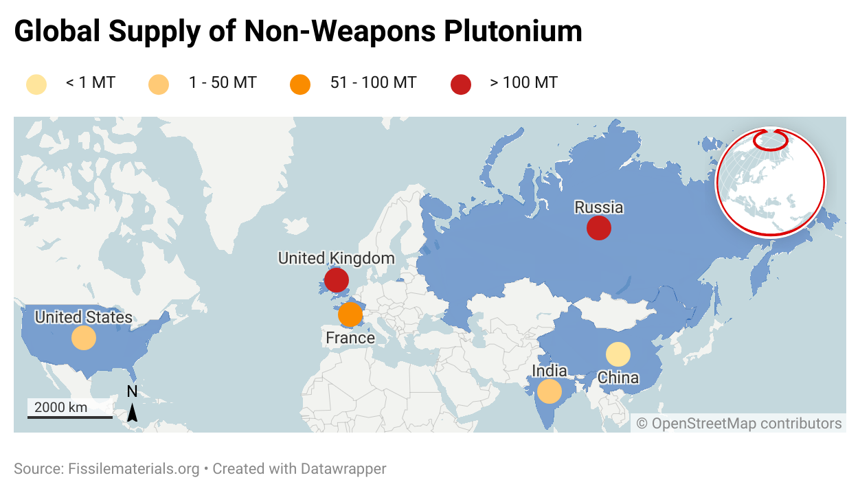 One of the largest challenges in utilising plutonium as nuclear fuel is the financial cost of reprocessing and Mixed Oxide Fuel (MOX) production. In the United States, the current “dilute and dispose” process to render “excess” weapons-grade plutonium unusable costs over USD 18b for a mere 34 MT of plutonium over 31 years. In comparison, MOX fuel production costs USD 17b in the US, but Orano has managed to operate France’s La Hague at a lower cost of approximately Euros 1.6b invested over 8 years. Even if countries remain opposed to reprocessing, there remains enough weapons-grade plutonium that can be diluted with uranium dioxide to produce MOX fuel, and stored non-weapons plutonium can also be retrieved for that purpose. While HALEU production is estimated to cost the US USD 3m per kilogram, MOX would be a better investment, with estimates ranging from USD $300 to $1600 per kilogram, with the average cost of reprocessing being USD $605 per kilogram between 2025 and 2085. Despite the high price, MOX fuel production would be more advantageous in the long run in relation to the current disposal process that wastes the potential of the existing plutonium supply.