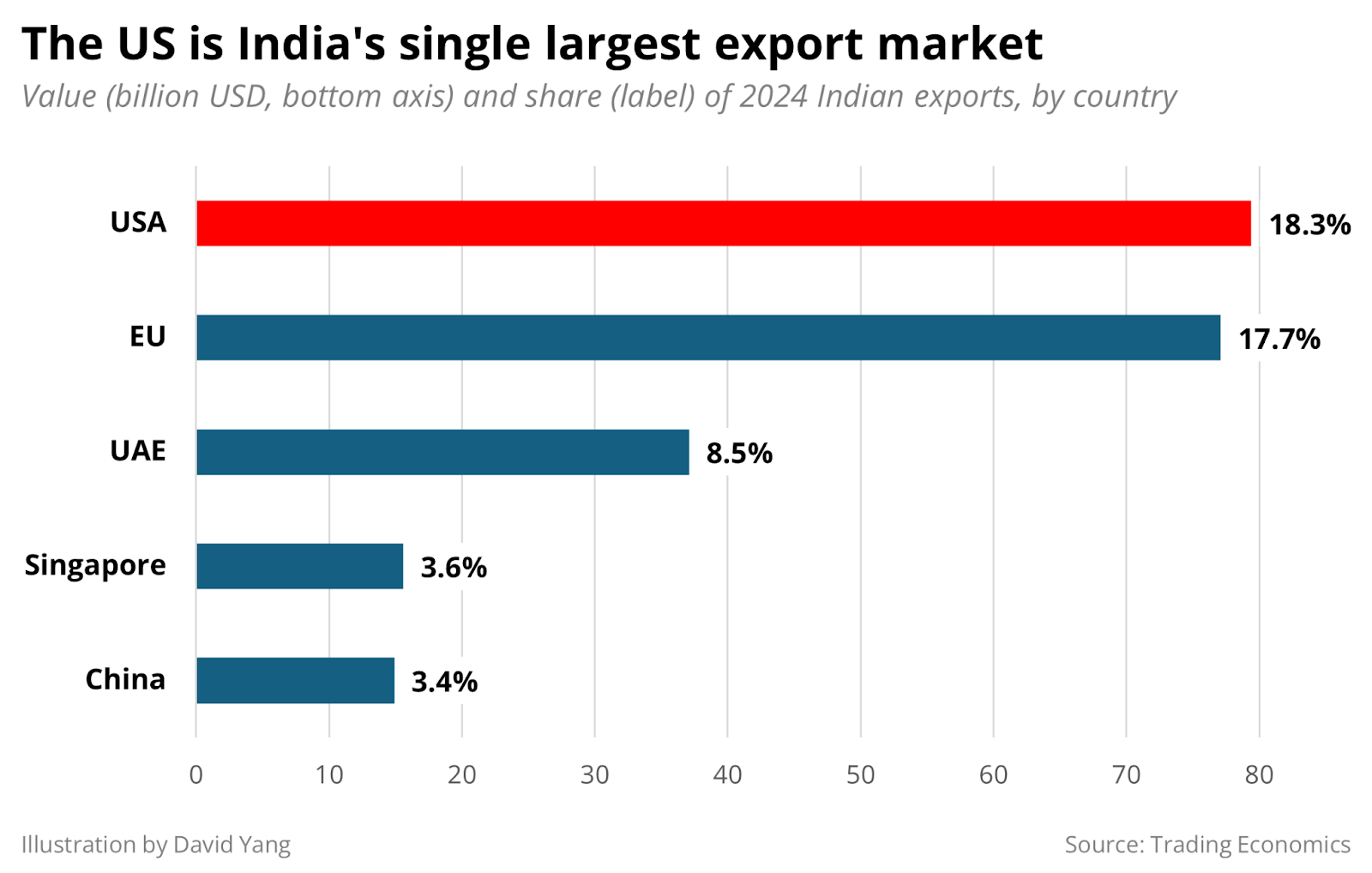 Trump’s 6 August announcement of 50% tariffs on Indian imports, the joint highest rate of any country alongside Brazil, marked the latest escalation in US-India trade relations. Trade negotiations had been ongoing since the “Liberation Day” tariffs in April, which were levied at 25%. The latest threatened rates, which went into effect on 27 August, were justified as “sanctions” on India over purchases of Russian crude oil following its invasion of Ukraine.